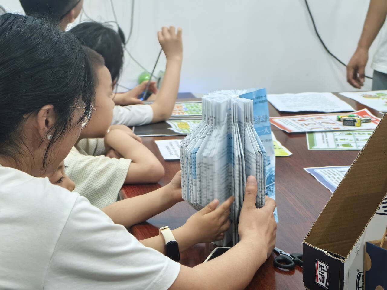 活动现场,志愿者们通过生动有趣的讲解和丰富多彩的互动形式,向社区孩子们介绍了环保的重要意义。他们利用图片、视频等资料,详细阐述了垃圾分类、节约用水、爱护动植物等环保知识,让孩子们深刻认识到保护环境与每个人息息相关。为了让孩子们更好地理解和实践环保行动,志愿者们还组织了垃圾分类小游戏,孩子们积极参与,准确地将各种“垃圾”进行分类投放。志愿者废物利用,用日常生活中的废旧物品制作小手工,教小朋友们进行折纸游戏,现场气氛热烈,孩子们的欢声笑语回荡在活动中心。
