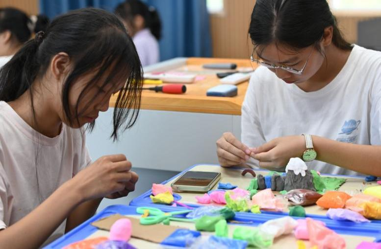 图为乡村留守儿童制作“生态山水卷”黏土作品