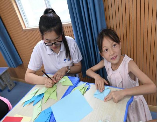 纸艺传薪火,非遗映童心。“凤凰灯是郧阳的传统非遗文化,它寓意着吉祥和美好……”志愿者们深情讲述着凤凰灯的历史渊源与文化内涵,围坐的孩子们屏息凝神,指尖早已跃跃欲试。紧接着,志愿者手把手教授折纸技艺——纸张对折的精准角度,羽翼翻卷的灵动技巧,凤首昂起的精妙弧度。孩子们的小手在彩纸间翩翩舞动,遇难题时轻扯志愿者衣角的细节,也让教学更显温情。当一只只绚丽的凤凰折纸跃然掌中,非遗的星火正通过稚嫩的指尖悄然传递。