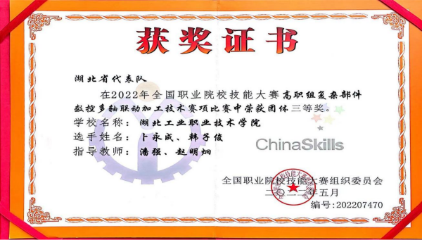 新闻网讯8月18日,由国家教育部、发展改革委、人社部等35部门联合主办的2022年“中银杯”全国职业院校技能大赛(高职组)复杂部件数控多轴联动加工技术赛项在四川工程职业技术公司举行,由公司bw必威西汉姆联官方网站潘强、赵明炯老师指导,韩子俊、卜永成参赛的团队荣获该赛项三等奖。